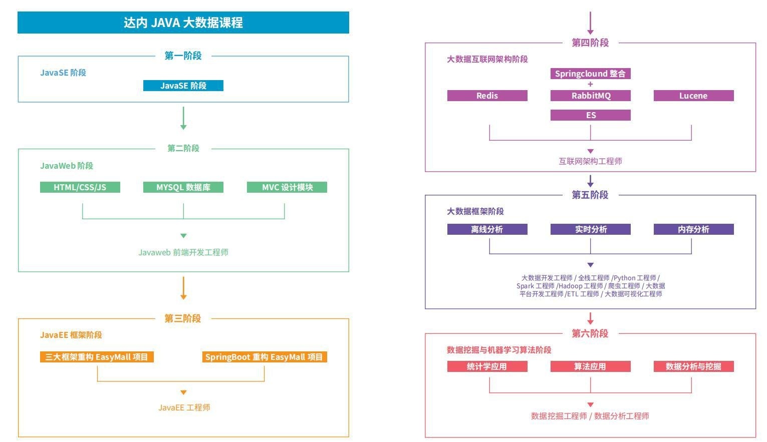 课程简介:课程覆盖 Java 语言基础、JavaEE 深度开发、互联网架构开发、大数据开发、算法数据挖掘分析 等 Java 大数据全栈技术内容,一站式解决学员 Java 大数据学习需求,满足学员高薪就业所需技术广度。