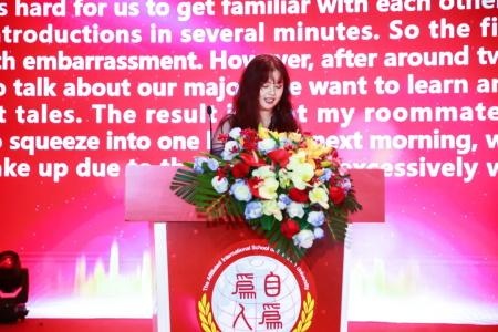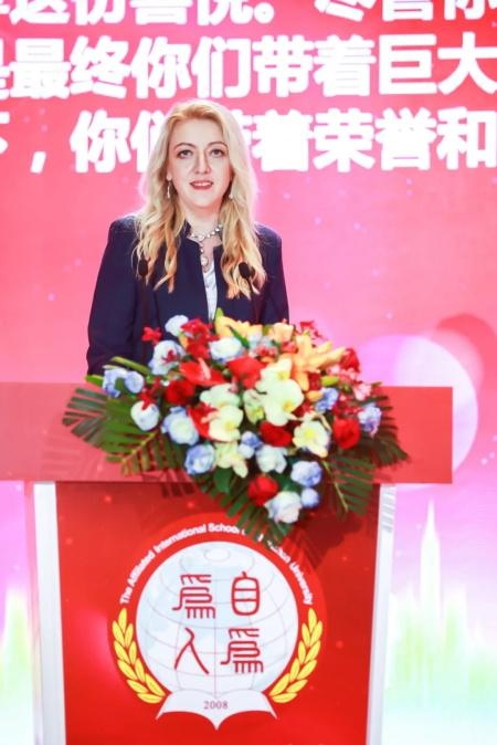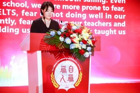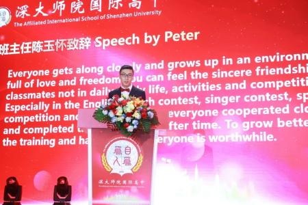 当你们开始在更广阔的天地奋斗的时候,我们希望你们拥有幸福、爱、平安和快乐,我们希望你们有激情和目标,我们希望你们能实现你的心愿,我们希望你们能找到自己内心善良的勇气和坚持不懈的力量。我们相信你们将继续很好地代表这所学校,并且在你们的一生中,都会因在深大师院国际高中这段经历变成更好的自己。——外教代表BOBO