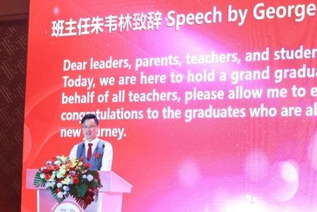 经历过如此不平凡的四年,希望你们都能够做到独立思考,明辨是非,做一个值得自己尊重的人。时刻谨记,你不止代表你自己,更代表一个国家的形象,所以也请你们时刻保持自信,因为你的背后是我们强大的祖国!所以,用你们舞动的青春,去搏击风云,去飞跃人生的新航程!——班主任代表朱韦林