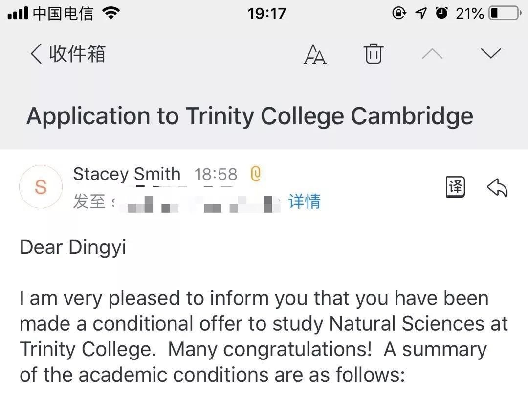 孙DY同学于去年12月前往英国参加剑桥面试后,终于在昨晚收到了剑桥大学中规模较大、财力较雄厚、名声较响亮的三一学院录取!这里也曾是牛顿、拜伦、培根等人学习的地方!