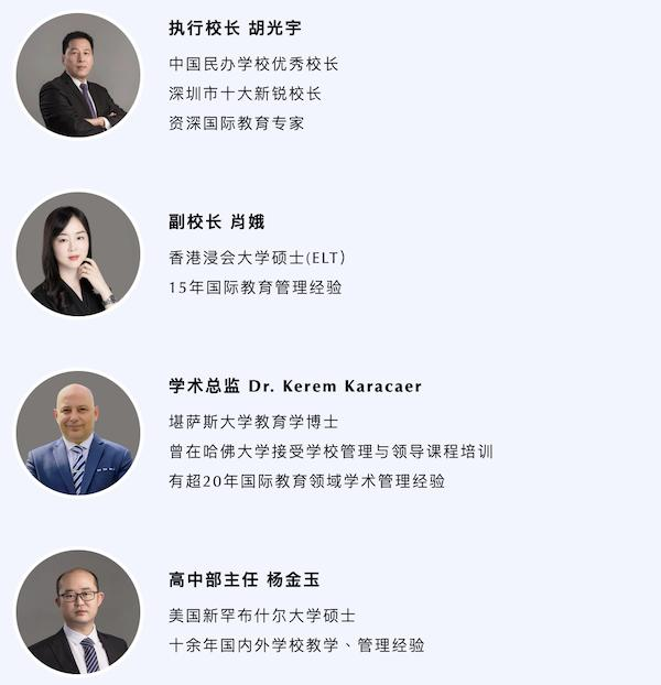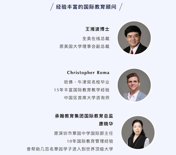 领 导和顾问团队中,既有来自曾任职美国大学理事会及哈佛、牛津毕业具有丰富国际教育经验的外国专家,也有长期从事国际教育的国内专家,国内外专家均有国际教育学校工作经历和留学教育突出成就。