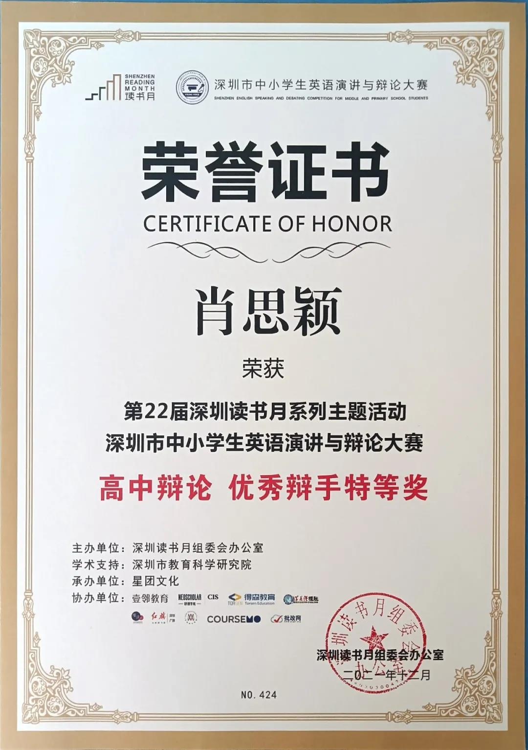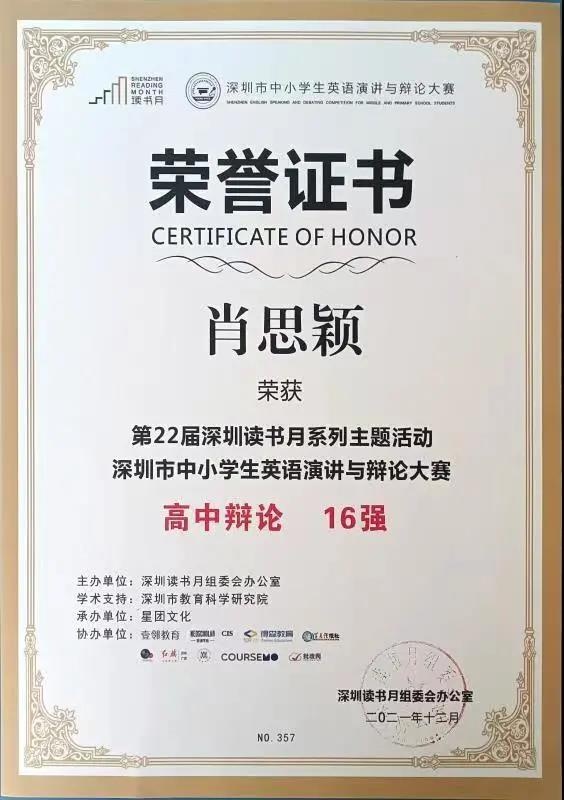 热烈祝贺深圳云顶博朤书院中五班肖思颖同学参加第22届深圳读书月系列主题活动之第五届深圳市中小学英语演讲与辩论大赛总决赛并荣获优秀辩手特等奖。她不是次参加EDS英语演大赛,上一届荣获了高中组二等奖、优秀辩手。