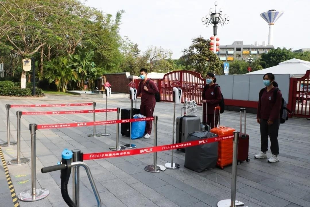在老师们的引导下,同学们"错峰"进入学校大门间隔1米进入缓冲区测体温,行李消毒等一系列防疫措施之后有序进入校园报道。
