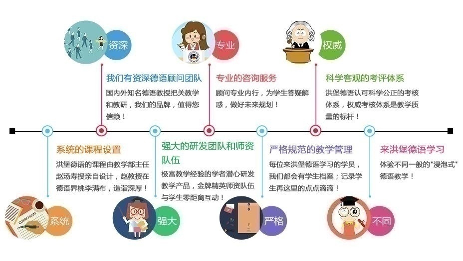 1、系统的课程设置:洪堡德语的课程由教学部主任赵汤寿授亲自设计,赵教授在德语界桃李满布,造诣深厚!